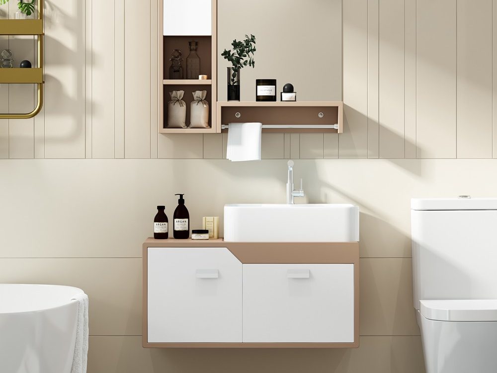 Maximize storage in a small bathroom by using vertical space. Choose a wall-mounted vanity or sink, utilizing the lower part for storing bathroom tools. This clever approach adds storage without taking up floor space, keeping your small bathroom organized and clutter-free.