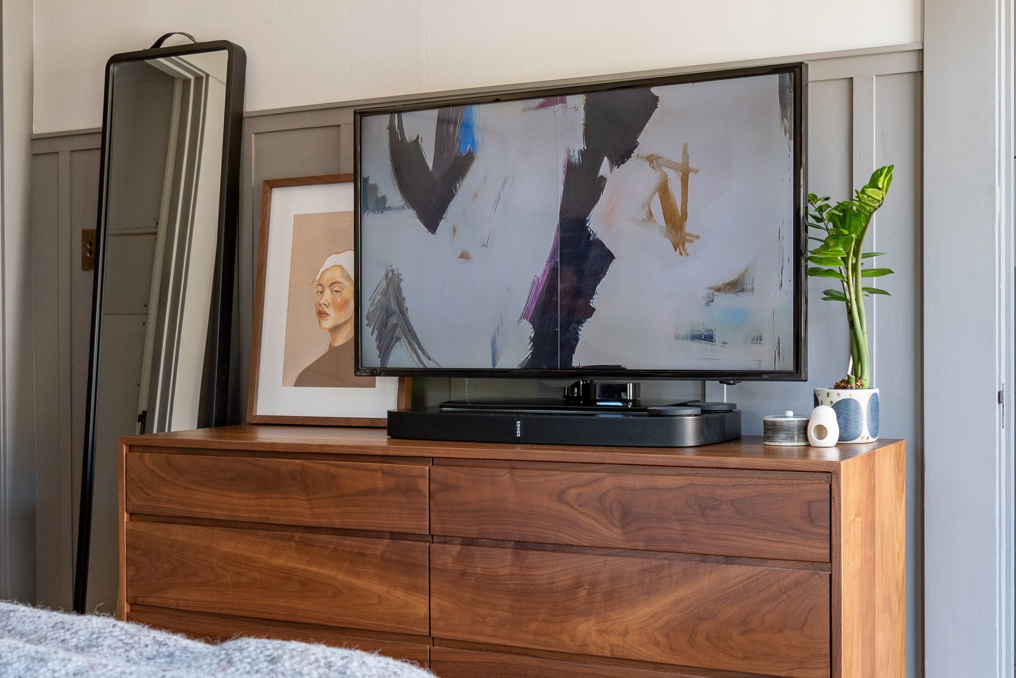 Bring mid-century vibes to your bedroom with a versatile TV cabinet design. Bright windows, calming curtains, and chevron-inspired flooring match the TV unit’s soft colors.