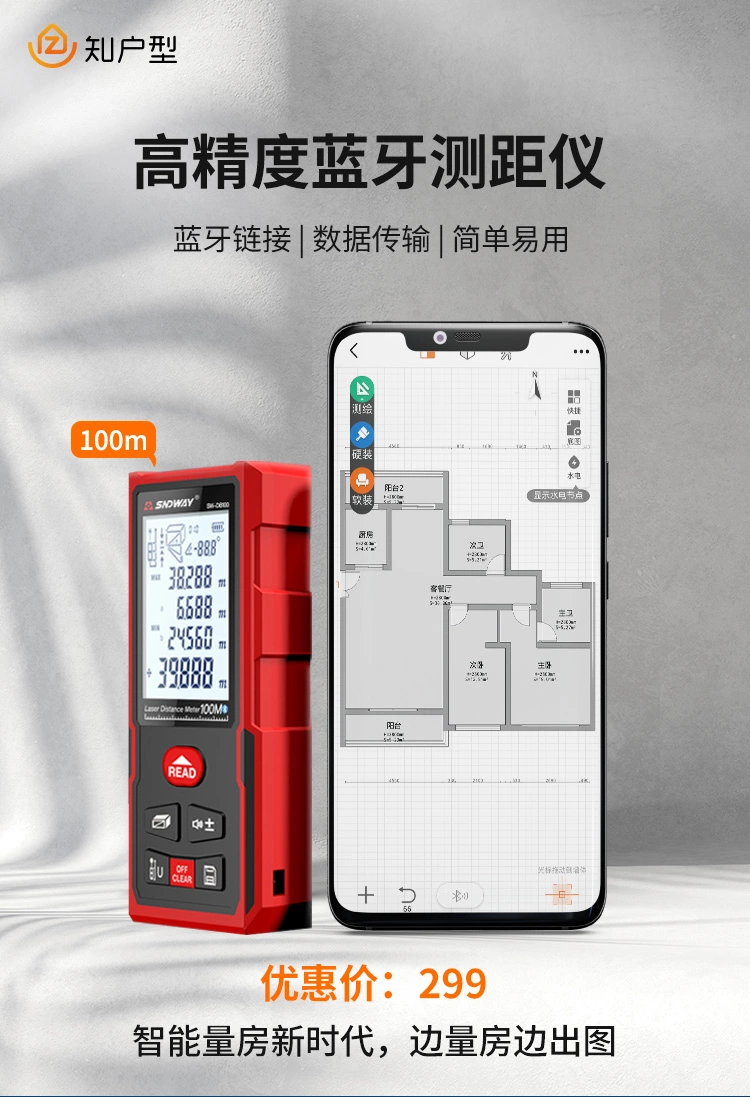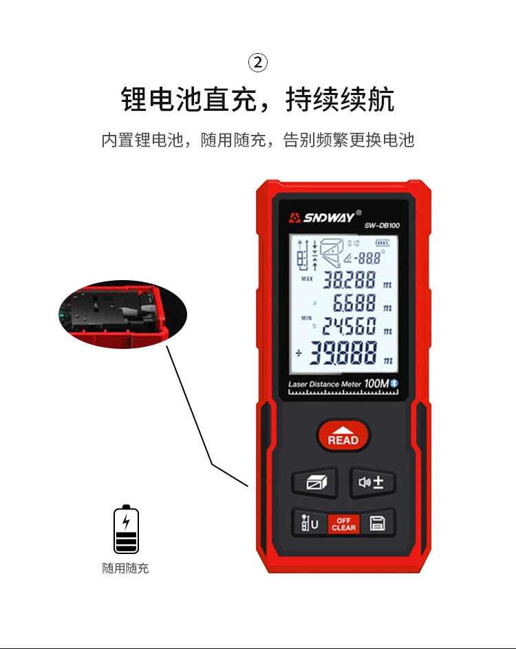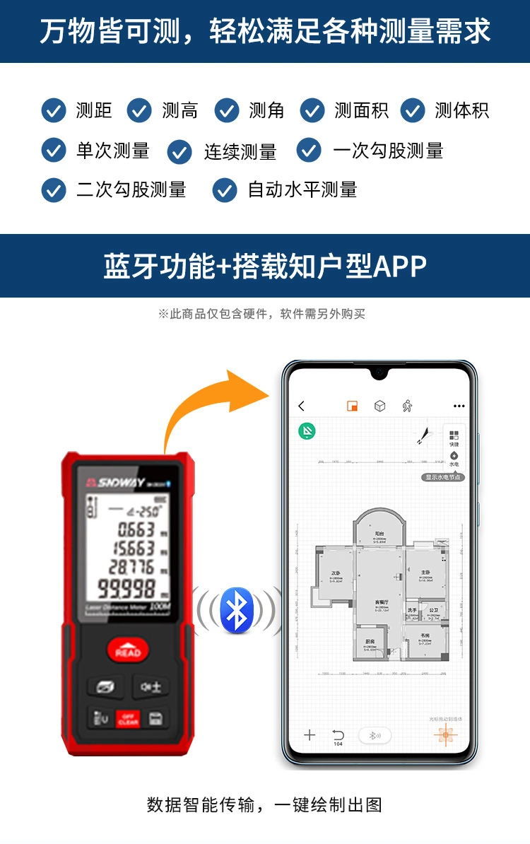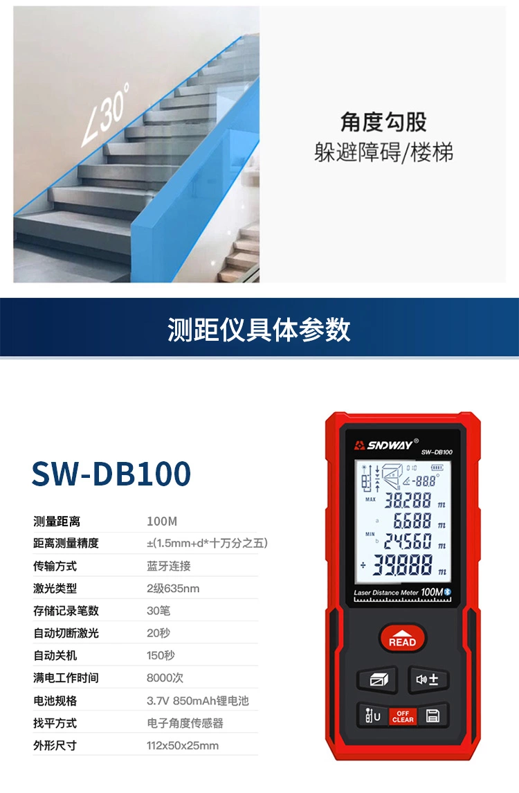* Bluetooth * 0.05m – 100m Max length of Measurement * 112x50x25mm * Rechargeable